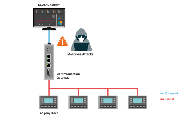 เกตเวย์การสื่อสาร (Communication gateways) สามารถช่วยขจัดข้อกังวลเหล่านี้ได้ เนื่องจากช่วยให้อุปกรณ์อิเล็กทรอนิกส์อัจฉริยะแบบอนุกรม (IED) สื่อสารกับเครือข่ายแบบอีเทอร์เน็ต (Ethernet communication)ได้ นอกจากนี้ยังเป็นโซลูชันที่คุ้มค่าเมื่อเทียบกับแพลตฟอร์มคอมพิวเตอร์ อย่างไรก็ตาม เมื่อแก้ปัญหา Serial-to-Ethernet ได้ ปัญหาอื่นก็โผล่ขึ้นมา : การโจมตีทางไซเบอร์มักจะก่อให้เกิดภัยคุกคามอย่างใหญ่หลวงต่อเครือข่ายที่ใช้อีเธอร์เน็ต ทำให้การรักษาความปลอดภัยทางไซเบอร์ในการติดตั้งสถานีไฟฟ้าย่อยเพิ่มเติมอยู่ในระดับแนวหน้า