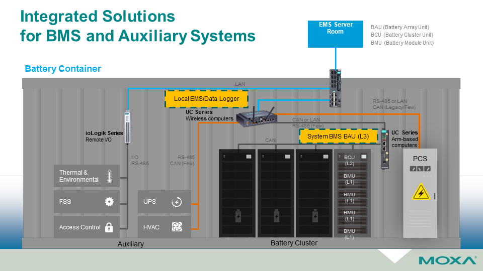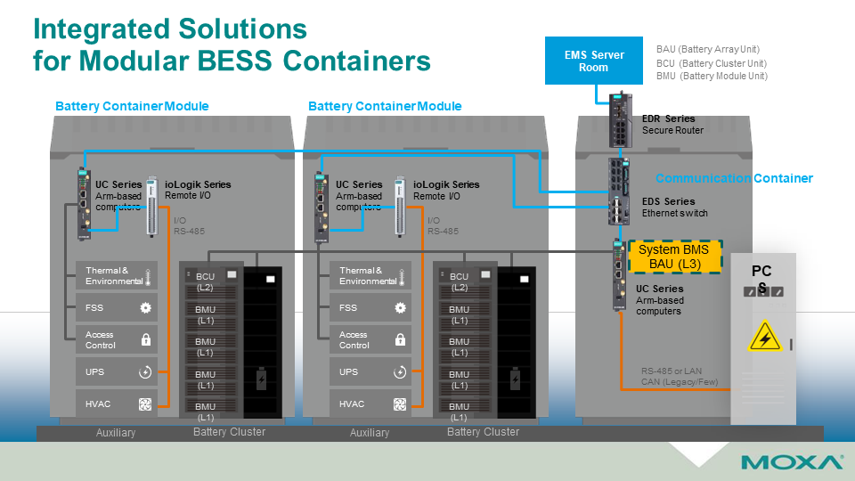 Moxa มีอุปกรณ์เสริมที่ช่วยในการติดตั้งการใช้งานในระบบ Battery Energy Storage System (BESS) ได้อย่างมีประสิทธิภาพตาม Diagram ดังรูปภาพข้างล่าง