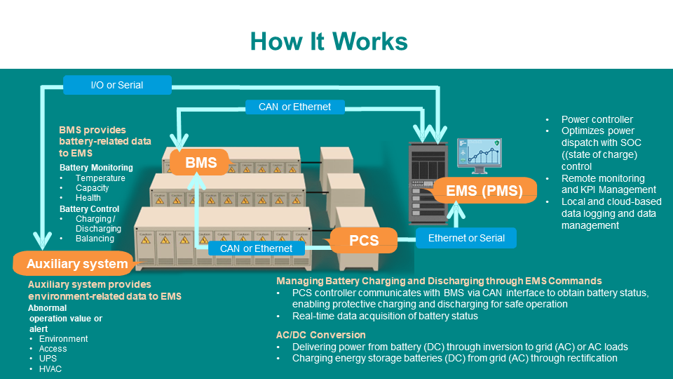 - PCS คือระบบกรองไฟฟ้า ตัวควบคุม PCS สื่อสารกับ BMS ผ่าน Can or Ethernet เพื่อรับสถานะแบตเตอรี่ เปิดใช้งานการชาร์จและการปล่อยเพื่อการทำงานที่ปลอดภัย การรับข้อมูลแบบเรียลไทม์ของสถานะแบตเตอรี่ และส่งข้อมูลผ่าน Ethernet or Serial ไปยังระบบ EMS (PMS)
