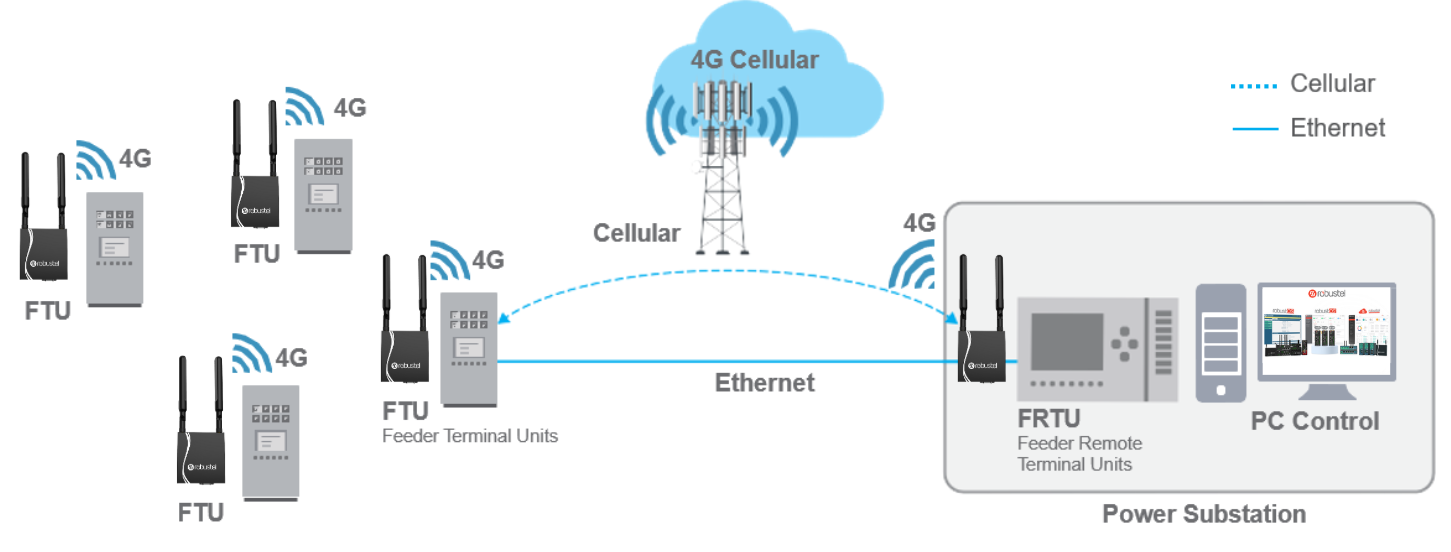 Industrial router Robustel R3000 Lite ที่ใช้ในงาน Power substation ซึ่งห้อง Control (FRTU) และ FTU อยู่คนละสถานที่ ซึ่งอาจจะไม่สะดวกต่อการเชื่อมต่อผ่านสาย Cable หรือใช้เป็นอุปกรณ์สำหรับ Backup ในกรณีที่สาย Cable ขาด